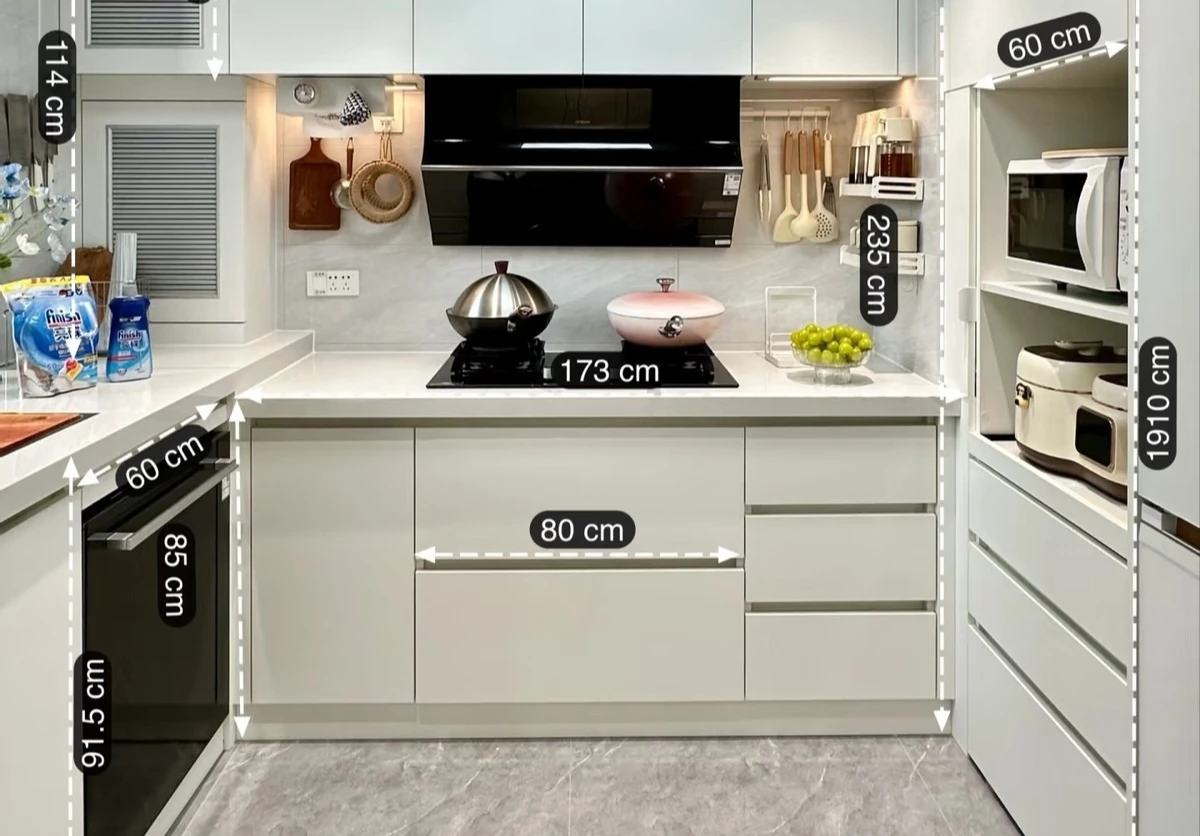 Mẹo bố trí: Tuân thủ quy tắc tam giác vàng (rửa - sơ chế - nấu), mặt bếp cao bằng chiều cao người dùng 5cm, đồng thời bố trí nhiều ổ cắm và đèn chiếu sáng.