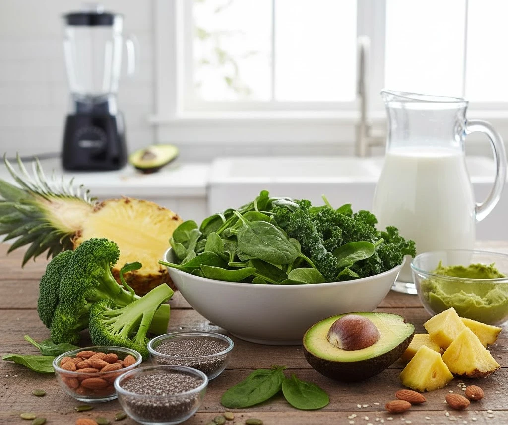 Để thực hiện đủ các công thức sinh tố xanh trẻ hóa làn da , cần chuẩn bị sẵn các nhóm nguyên liệu: