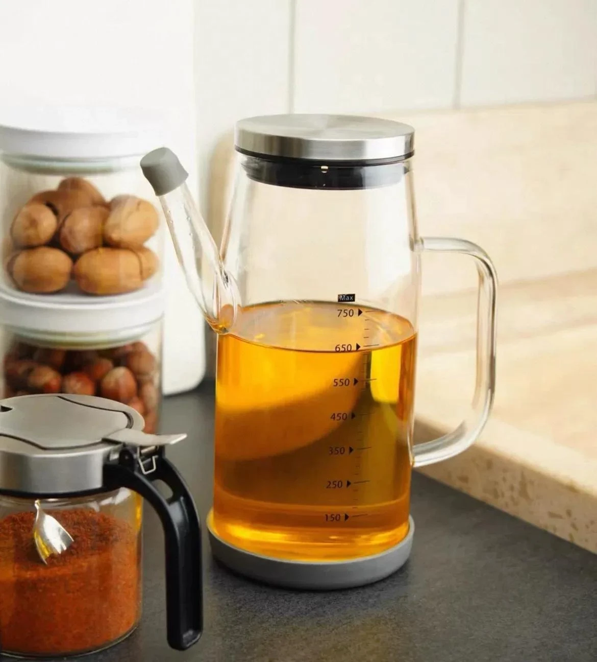 Thoạt nhìn, chiếc bình thủy tinh miệng rộng, dáng đẹp và được quảng cáo là rót không vương dầu, tưởng chừng rất tiện lợi. Nhưng khi dùng mới thấy bất cập: chỉ cần đổ quá nửa bình, lúc rót dầu liền tràn ra nắp, bắn tung tóe. Kết quả là chỉ dám rót nửa bình, mà lúc nào cũng thấy thiếu. Thực tế, chưa có loại bình nào thực sự ngăn dầu dính 100%. Việc rót qua bình phụ còn dễ khiến dầu cũ lẫn vào dầu mới nếu không vệ sinh thường xuyên.