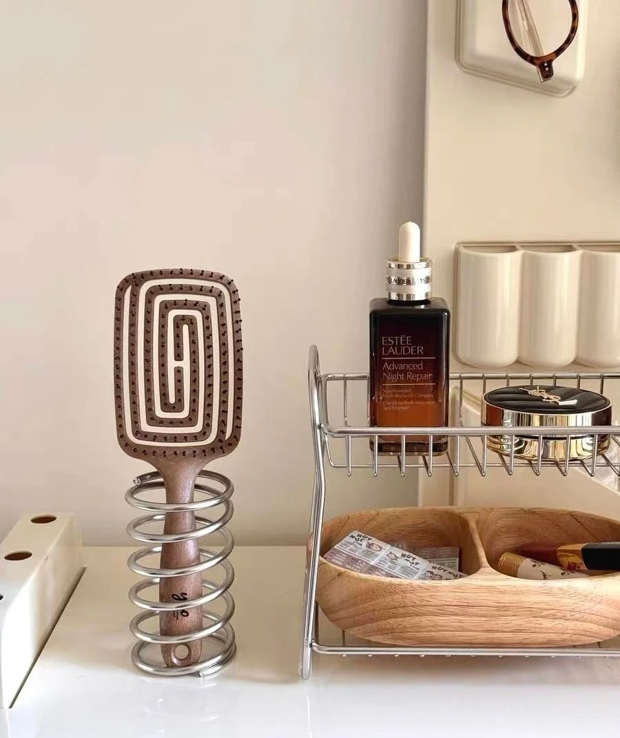 Ý tưởng ban đầu nghe khá ổn: bàn chải tóc được cắm vào giá xoắn lò xo, vừa gọn gàng vừa dễ lấy. Tuy nhiên, khi đặt trong phòng tắm, hơi nước và nước văng khiến lò xo nhanh chóng gỉ sét, để lại vết ố loang trên mặt bàn, trông rất kém thẩm mỹ. Đồ kim loại không nên để ở nơi ẩm thấp như phòng tắm. Nếu thật sự muốn dùng, chỉ nên đặt ở không gian khô ráo như phòng ngủ hoặc phòng khách.