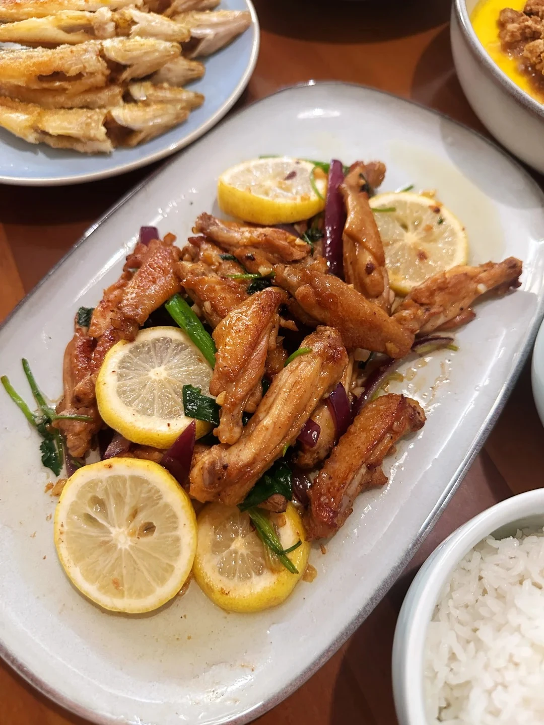 Mở đầu cho bản hòa tấu hương vị hôm nay là món cánh gà sốt chanh. Khác với những món gà chiên mắm hay kho gừng quen thuộc đôi khi hơi đậm và nặng vị, phiên bản sốt chanh này mang đến một làn gió mới mẻ, thanh thoát hơn hẳn. Những chiếc cánh gà được cắt đôi vừa miệng, sau khi thấm khô thì được tẩm ướp kỹ càng trong 30 phút với hỗn hợp "thần thánh" gồm nước tương, hắc xì dầu hoặc nước tương chuyên dụng tạo màu hổ phách, chút dầu hào, đường, tiêu đen và thìa rượu nấu ăn để khử tanh.