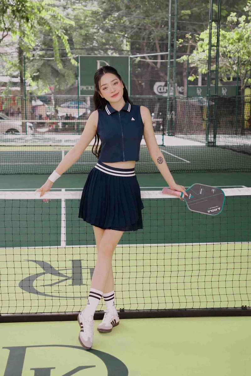 Bạn có thể lựa chọn những chiếc tank top cổ polo mang lại sự năng động, thiết kế khóa kéo tinh tế khi phối cùng chân váy tennis tone sur tone sẽ tạo diện mạo vừa khỏe khoắn vừa yêu kiều. Đôi giày thể thao trắng đóng vai trò cân bằng tổng thể, giúp bản phối trở nên gọn gàng và chuyên nghiệp, hoàn hảo cho những buổi tập pickleball hay hoạt động ngoài trời