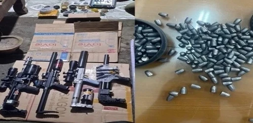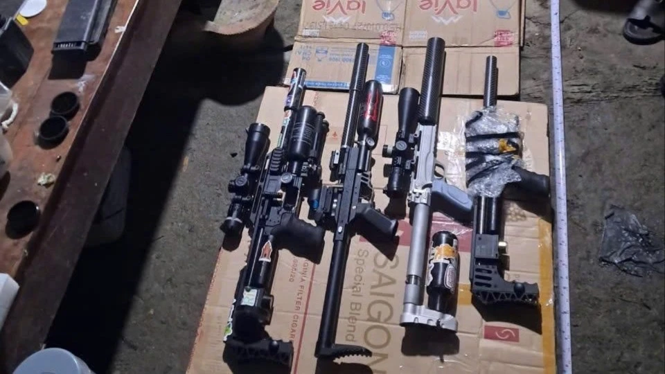 Khám xét nơi ở của các đối tượng, công an thu giữ 3 khẩu súng hơi, 1 khẩu súng Rulo, 22 hộp đạn các loại, cùng nhiều linh kiện dùng lắp ráp súng.