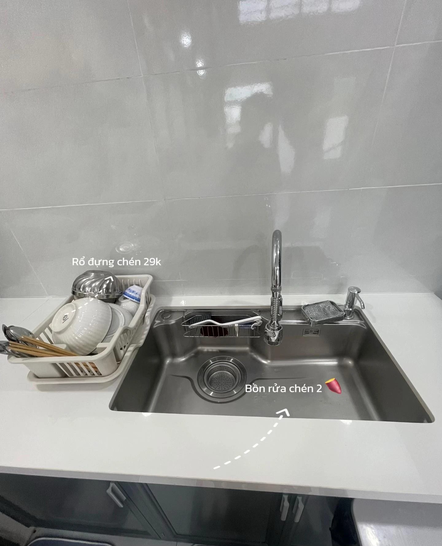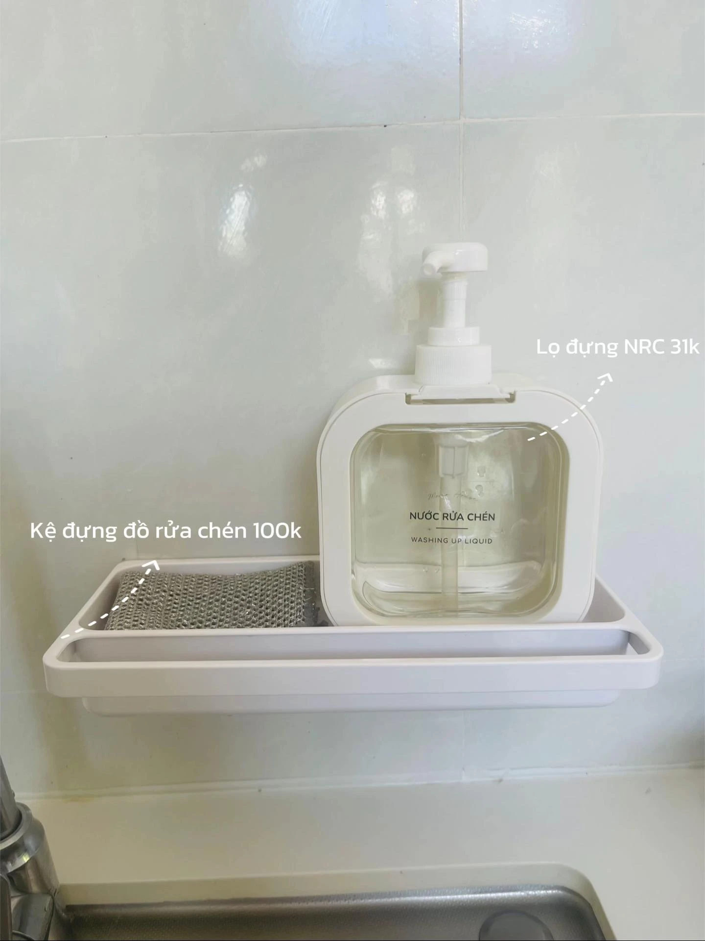 Với kệ đựng đồ rửa chén chỉ 100k, chai nước rửa chén, bọt biển, khăn lau đều có chỗ riêng. Nhỏ mà tiện, giữ bồn rửa luôn khô ráo, sạch sẽ.