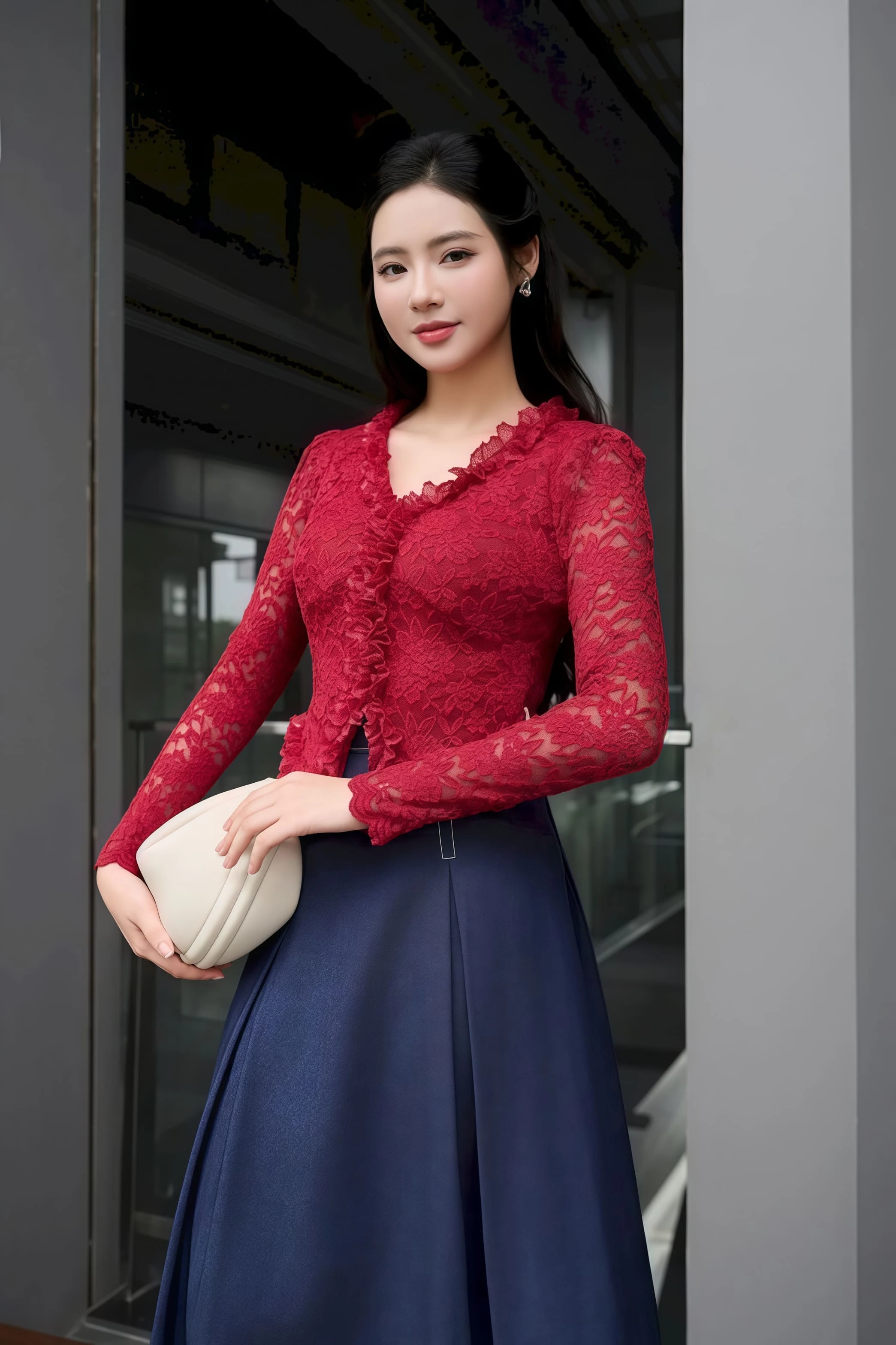 Vải ren trong bộ trang phục chính là điểm nhấn tinh tế, mang đến cảm giác vừa nữ tính, vừa sang trọng. Ren vốn gắn liền với sự mềm mại và lãng mạn, giúp tổng thể trang phục trở nên bay bổng và thanh thoát hơn