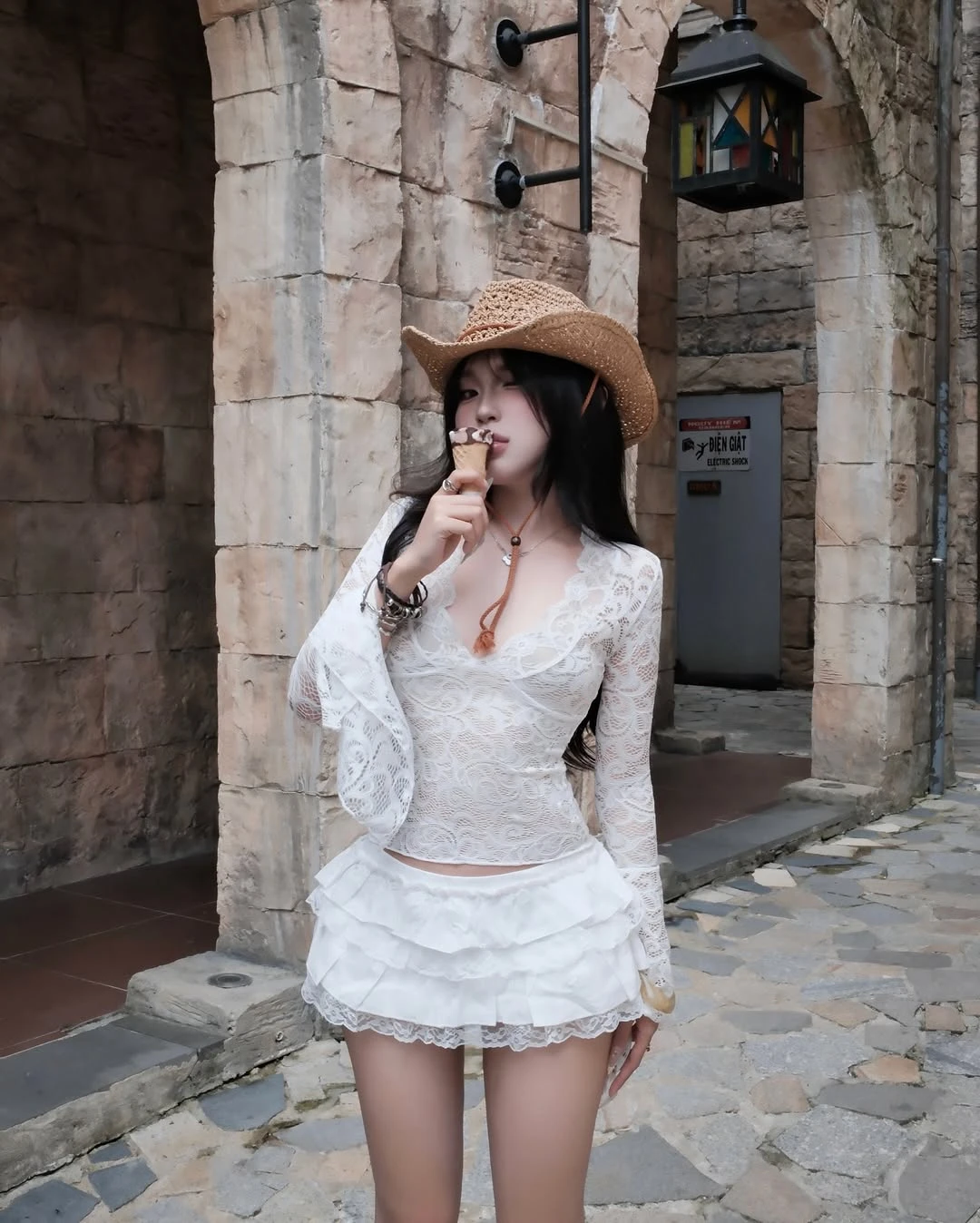 Thiết kế áo ren xẻ tà trắng tinh tế điểm xuyết độc đáo với chi tiết dây đan ở cổ áo tạo nên vẻ ngoài vừa lãng mạn, vừa cực kỳ cá tính . ẢNH: @NGOCHUYEN.NGN