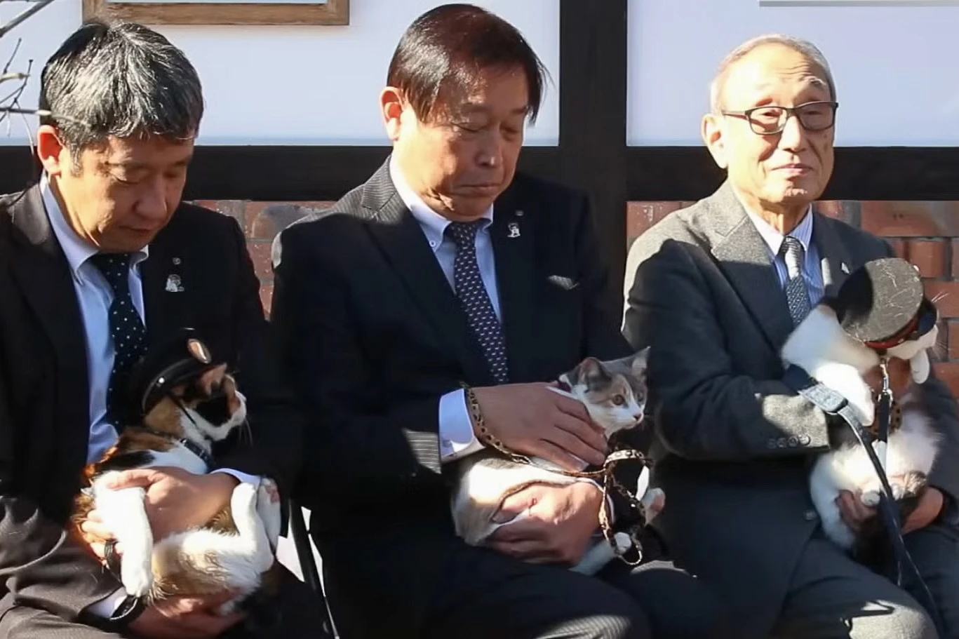 Một số lãnh đạo địa phương và đại diện công ty có mặt để bổ nhiệm chú mèo tam thể Yontama lên làm trưởng ga Kishi.