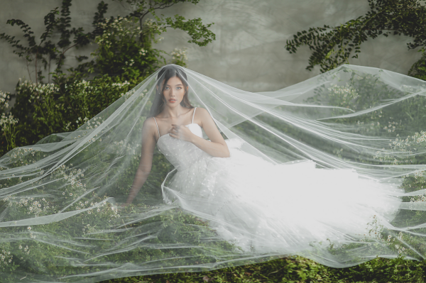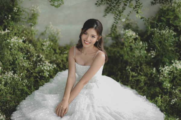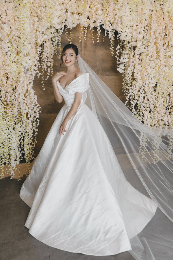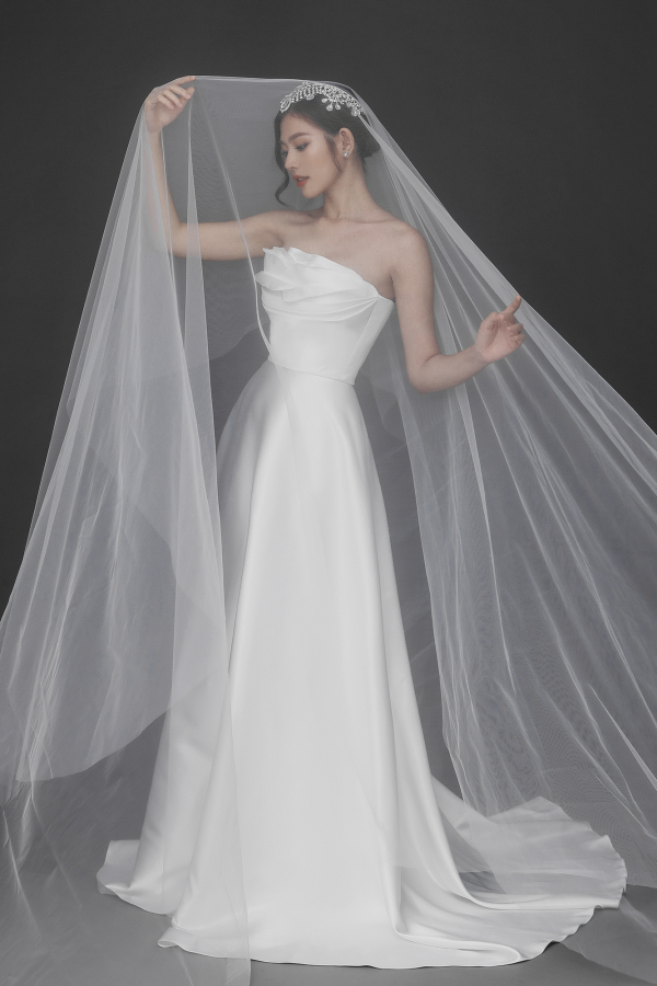Trong khi đó, mẫu váy cưới satin cao cấp chiết eo với điểm nhấn nơi ngực áo cũng khiến người mẫu 9X trở nên duyên dáng, thanh lịch. Chúng Huyền Thanh còn gây ấn tượng với chiếc veil cài tóc cổ điển có độ dài hoành tráng.