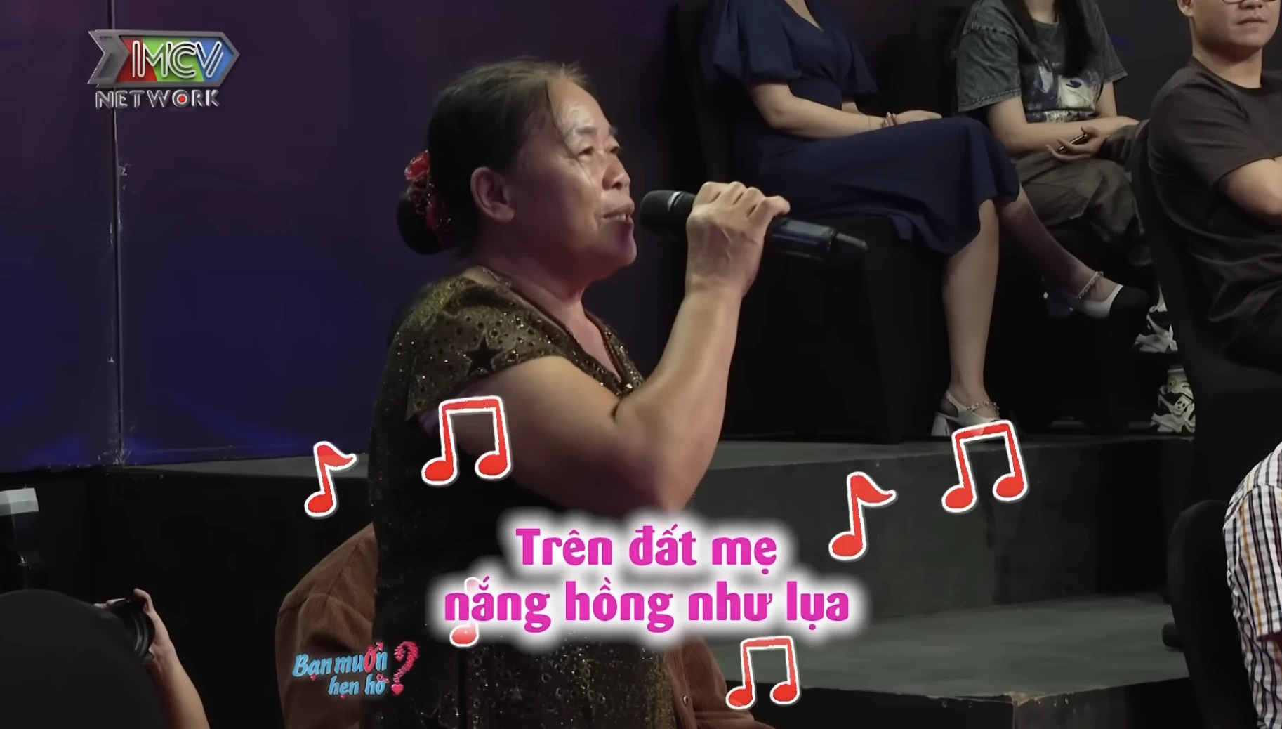 Mẹ Sỹ Cường bất ngờ lên hát thay con trai, mang đến không khí sôi nổi cho trường quay . Ảnh: Chụp màn hình
