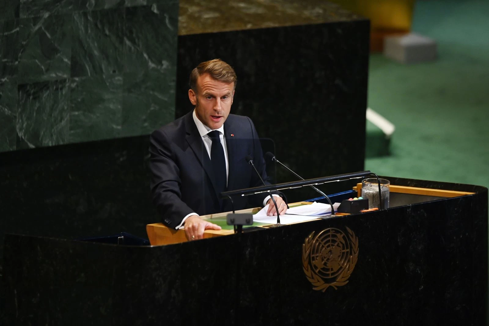 Tổng thống Pháp Emmanuel Macron tuyên bố: “Chúng ta tập trung ở đây vì thời điểm đã đến. Trách nhiệm thuộc về chúng ta phải làm mọi cách để duy trì khả năng của giải pháp hai nhà nước. Hôm nay, Pháp chính thức công nhận Nhà nước Palestine”. Ông cũng đề xuất thành lập một “Chính quyền Palestine đổi mới”, trong đó bao gồm một Lực lượng Ổn định Quốc tế hỗ trợ chuẩn bị cho Chính quyền Palestine (PA) tiếp quản quyền quản lý ở Gaza.