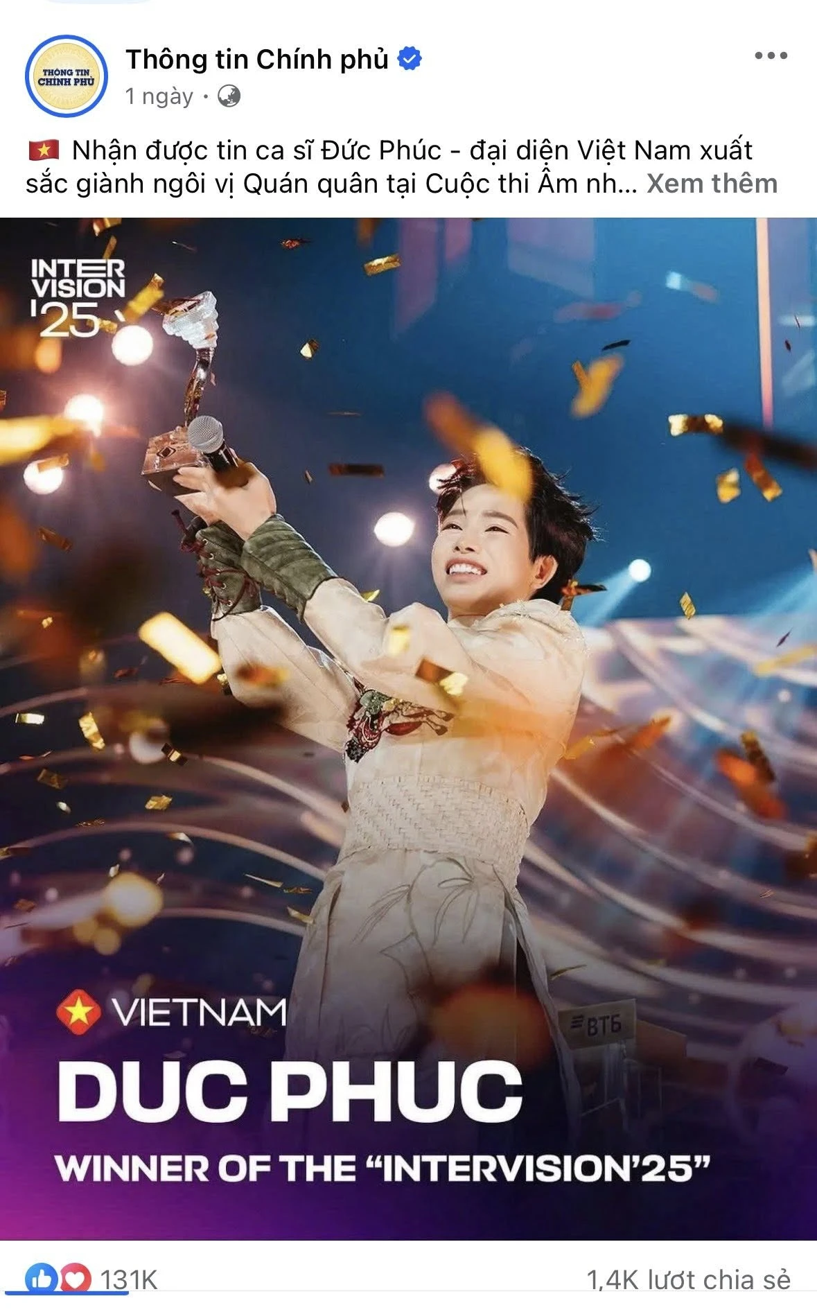 Tối 20/9 (giờ Nga), tại sân vận động Live Arena (Moscow), Đức Phúc - đại diện Việt Nam đã xuất sắc giành ngôi Quán quân cuộc thi âm nhạc quốc tế Intervision 2025, sự kiện quy tụ nhiều tài năng lớn từ khắp nơi trên thế giới. Chiến thắng này nhanh chóng trở thành tâm điểm chú ý, thu hút sự quan tâm đặc biệt của công chúng trong và ngoài nước.