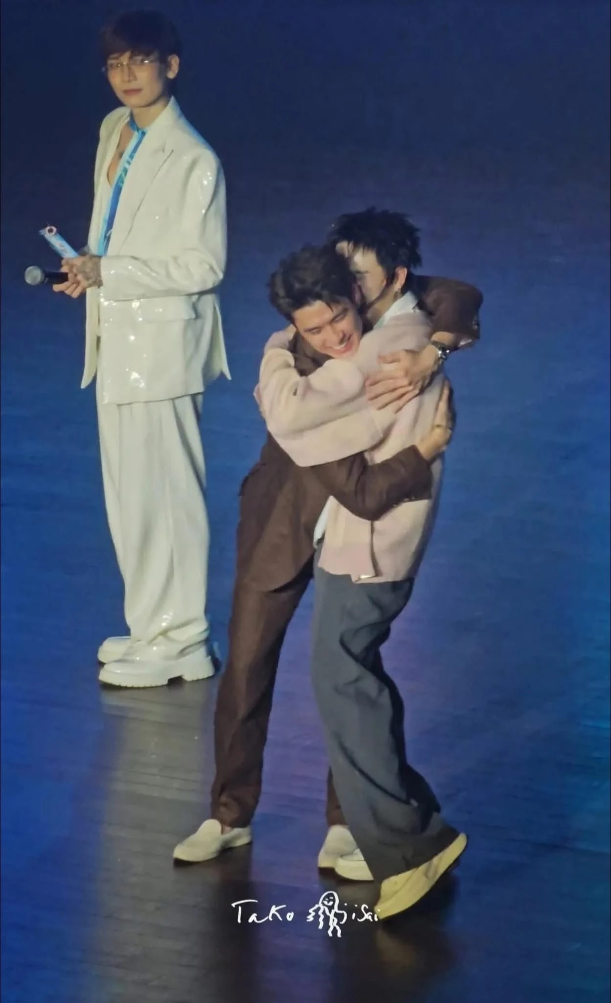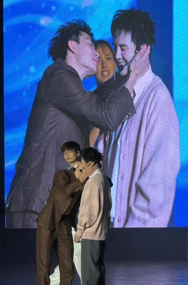 Khoảnh khắc Hoàng Trung hôn má Duy Khánh trên sân khấu. Ảnh: Tổng hợp