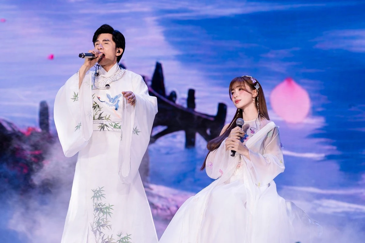 Đan Trường và Hoà Minzy lựa chọn diện trang phục cổ phong, tông màu trắng nhẹ nhàng, mái tóc buông dài. Khi cùng Đan Trường thể hiện Mộng Tình Si - ca khúc mới của anh Bo, khán giả như được nhìn thấy một phiên bản Hoà Minzy chưa từng có. Cô nàng mềm mại, e ấp, thậm chí hơi "sến" nhưng đầy duyên dáng. Sự tương tác giữa hai thế hệ ca sĩ, một người là biểu tượng thanh xuân của Vpop, một người là đại diện của lớp nghệ sĩ trẻ đương đại tạo nên cảm xúc giao thoa đặc biệt.
