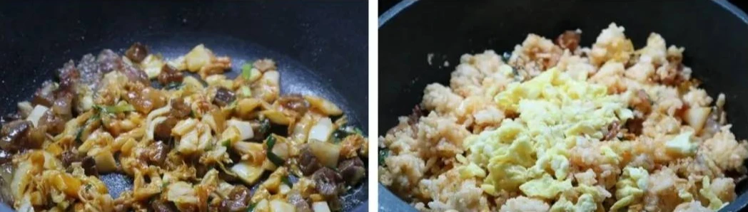 Bước 1: Lạp xưởng bạn thái nhỏ hình hạt lựu, để riêng. Kim chi nắm bỏ bớt nước rồi thái nhỏ, để riêng. Đập trứng vào bát sau đó đánh tan với chút muối và vài giọt giấm trắng. Tiếp theo đặt chảo lên bếp, đun nóng dầu ăn rồi cho hỗn hợp trứng vào, đảo nhanh tay cho chín rồi lấy ra, để riêng.