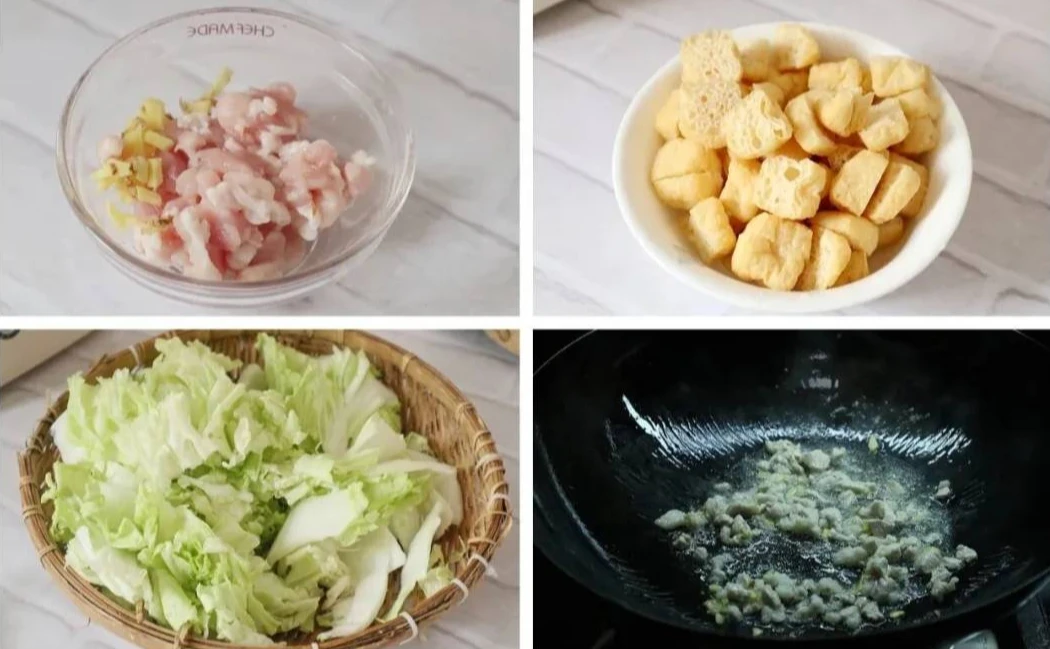 Bước 1: Rửa sạch và lột da thịt ba chỉ sau đó thái lát mỏng rồi tiếp tục thái dạng sợi. Băm nhỏ gừng và tỏi. Rửa sạch rau cải thảo và cắt thành các miếng vừa ăn. Đậu phụ cắt thành miếng vuông rồi đem chiên vàng. Để lại một chút dầu trong chảo, cho tỏi và gừng băm vào phi thơm. Sau đó trút thịt ba chỉ vào xào cho đến khi tiết bớt mỡ. Tiếp đó bạn cho đậu phụ đã chiên vào xào cùng trong khoảng vài giây.