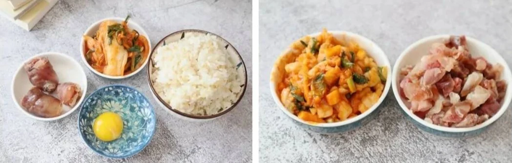 Thành phần nguyên liệu: Một bát cơm nguội, một ít kim chi, 1 quả trứng gà, 1 cây lạp xưởng, một chút gia vị, một chút tinh chất cốt gà.