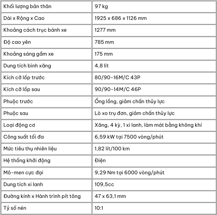 Bảng thông số kỹ thuật của Honda Vision: