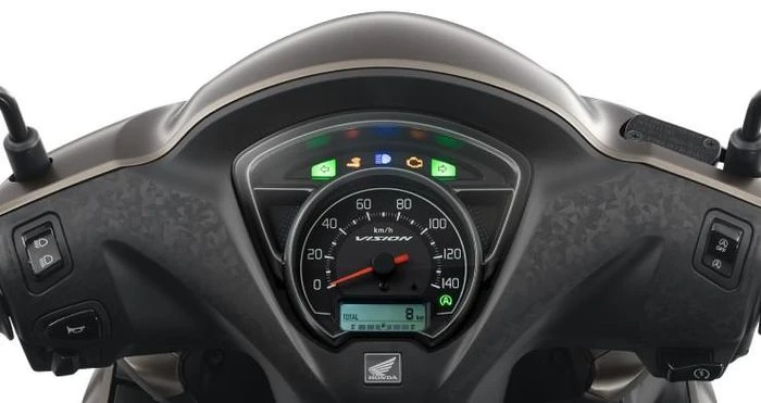 Mặt đồng hồ được thiết kế thanh lịch với màn hình LCD hiển thị rõ ràng mức nhiên liệu và quãng đường, mang đến trải nghiệm sử dụng hiện đại, tiện lợi. Bánh trước kích thước lớn 16 inch không chỉ giúp tư thế lái thoải mái, tầm nhìn thoáng mà còn tăng tính ổn định khi vận hành.