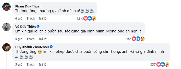Chính vì vậy, khi hay tin ông không qua khỏi, nhiều khán giả đã bày tỏ sự tiếc thương. Dưới bài đăng của chị Thông, hàng loạt nghệ sĩ để lại lời chia buồn. Jun Phạm viết ngắn gọn nhưng đầy cảm xúc: "Thương ông, thương gia đình mình". Rhymastic cũng gửi lời tiễn biệt, mong ông an nghỉ. Duy Khánh – người từng bật khóc khi chia tay gia đình chị Thông trong chương trình – không giấu được sự xót xa khi gửi lời chia buồn đến cả nhà.