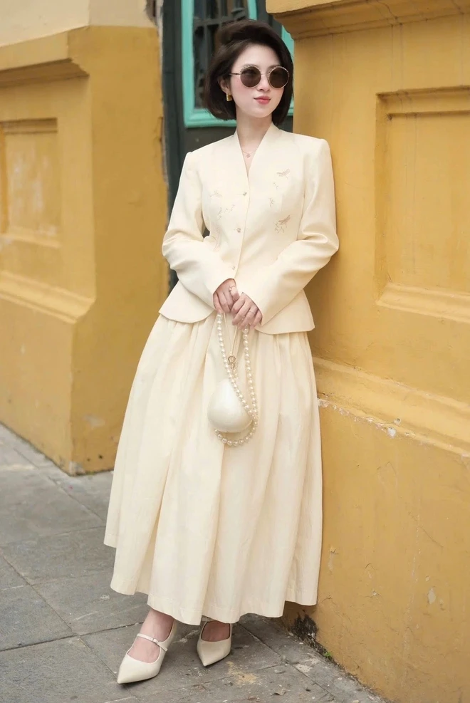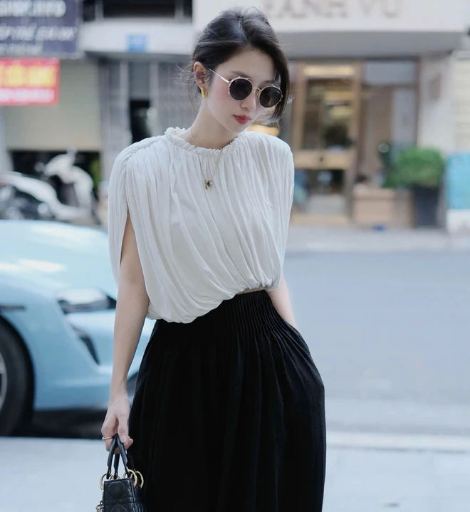 Áo dáng suông nhẹ, có chiết eo tinh tế hoặc nhấn ở phần vai giúp điều chỉnh tỷ lệ hình thể, đặc biệt phù hợp với người có thân hình tròn hoặc vai xuôi. Trong khi đó, váy chữ A, váy wrap (váy quấn) hay váy midi với độ rủ mềm là lựa chọn kinh điển, vừa che khuyết điểm vòng 2 và hông, vừa giữ được vẻ nữ tính, thanh lịch.
