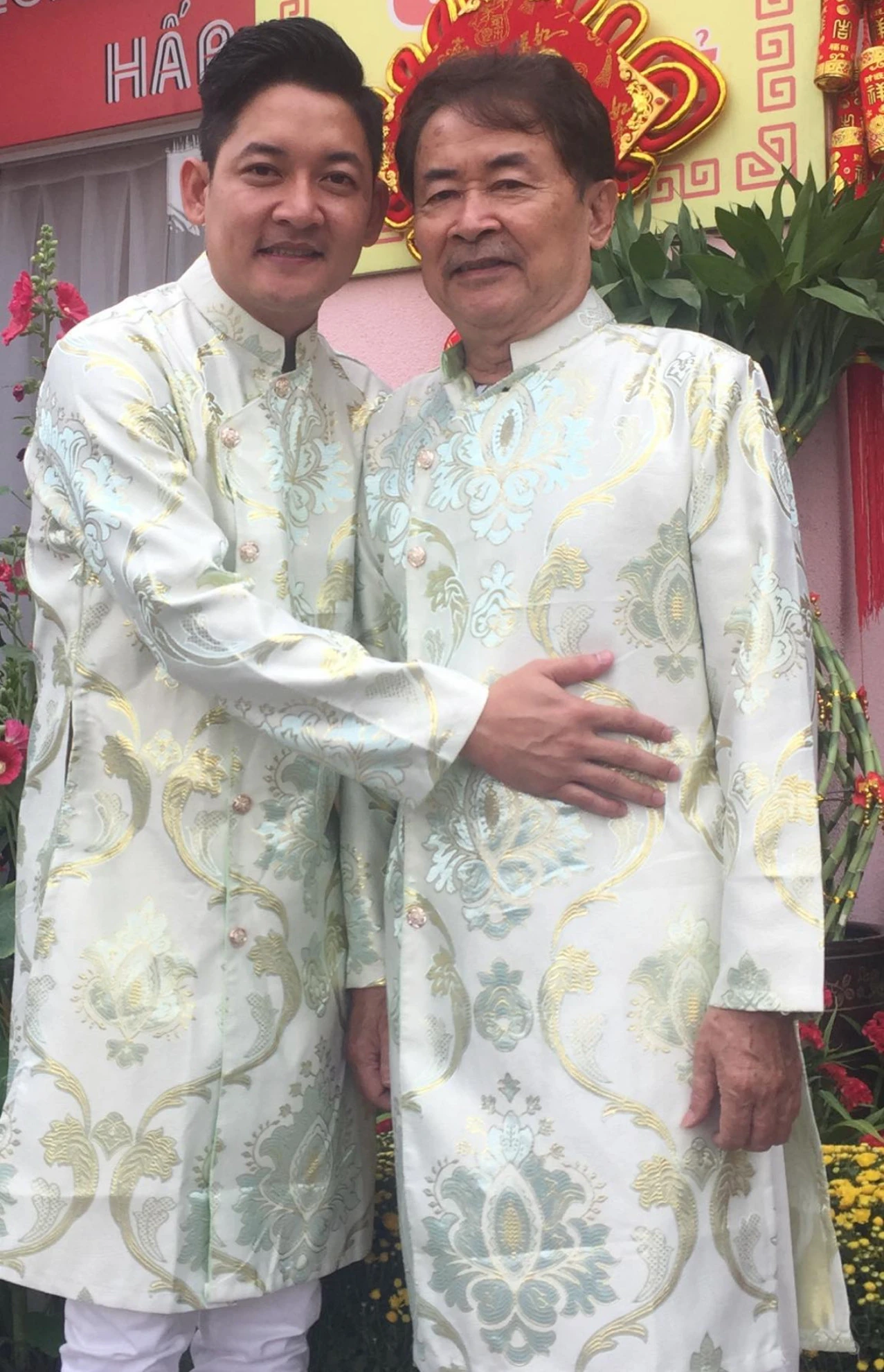 NSƯT Hai Nhất “Biệt động Sài Gòn” và con trai – diễn viên Thành Đạt diện áo dài chụp ảnh Tết.