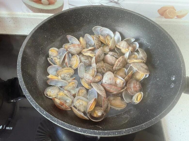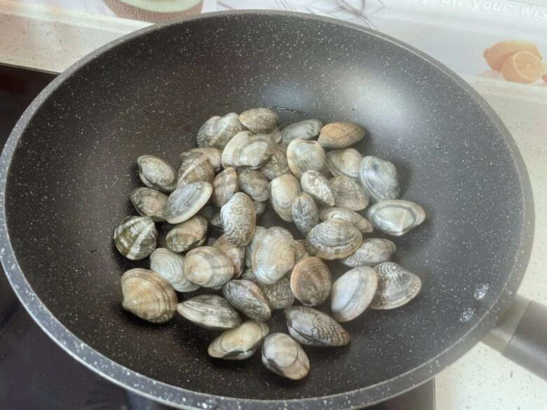 Ngao rửa nhiều lần dưới vòi nước cho sạch cát. Sau đó cho ngao vào nồi, thêm một ít nước (không cần cho nhiều vì ngao sẽ tự tiết nước).