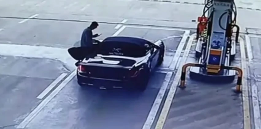 Theo hình ảnh từ camera giám sát, một chiếc Porsche màu đen, không có biển số, vào trạm xăng. Chiếc xe được đổ xăng đầy bình, hết tổng cộng 502,29 Nhân dân tệ (1,7 triệu đồng).