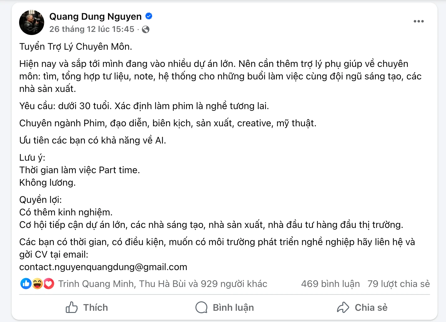Trong bài đăng, đạo diễn cho biết công việc nói trên không có lương nhưng bù lại là cơ hội tích lũy kinh nghiệm, tiếp cận các dự án lớn, làm việc cùng các nhà sáng tạo, nhà sản xuất và nhà đầu tư trong ngành. Bài đăng tuyển trợ lý chuyên môn nhưng không có lương của đạo diễn nhanh chóng gây chú ý.