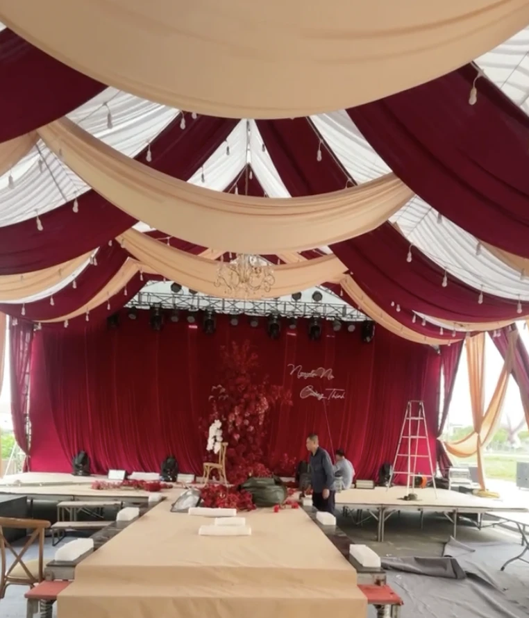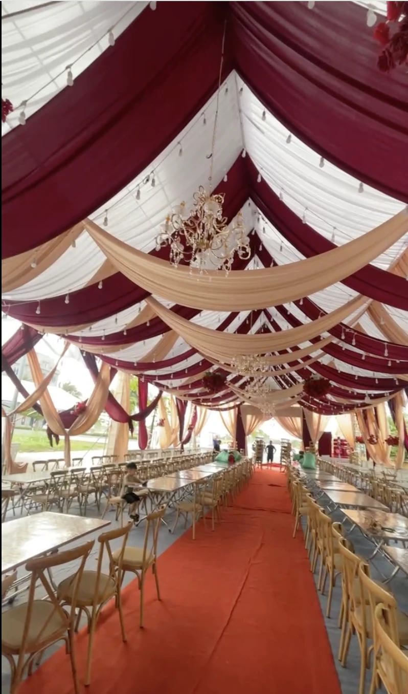 Không gian lễ cưới được dựng trên khu đất gần nhà Văn Toàn ở Hải Phòng với quy mô ấn tượng. Đám cưới sử dụng tông màu đỏ và kem sang trọng làm chủ đạo. Sân khấu chính được trang trí bằng những dải lụa mềm mại cùng hàng ngàn bông hồng đỏ rực rỡ, tạo nên vẻ đẹp vừa cổ điển vừa hiện đại.