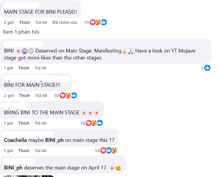 Trước sự bùng nổ của BINI tại Coachella 2026, một bộ phận lớn BLOOM (tên fandom của nhóm) và khán giả quốc tế đã yêu cầu ban tổ chức Coachella phải đưa BINI lên biểu diễn tại Main Stage vào tuần thứ hai hoặc ở các mùa giải sau. Họ cho rằng không gian của sân khấu Mojave quá chật hẹp, không xứng tầm với sức hút hiện tại của nhóm.