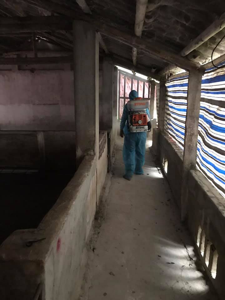 Cán bộ thú y khử trùng tiêu độc chuồng trại.