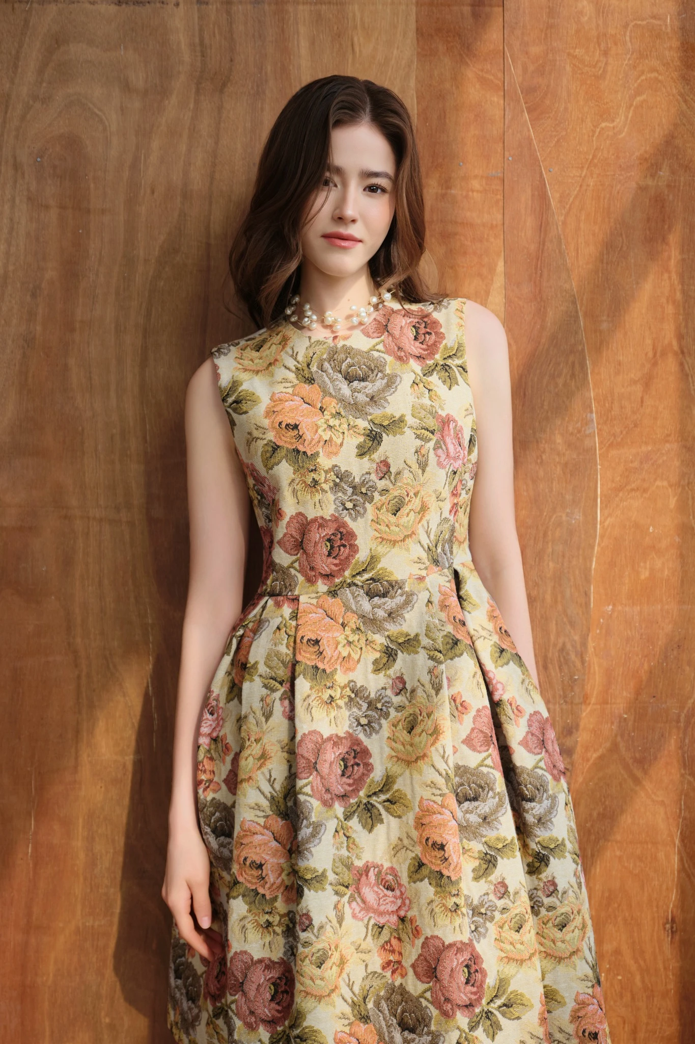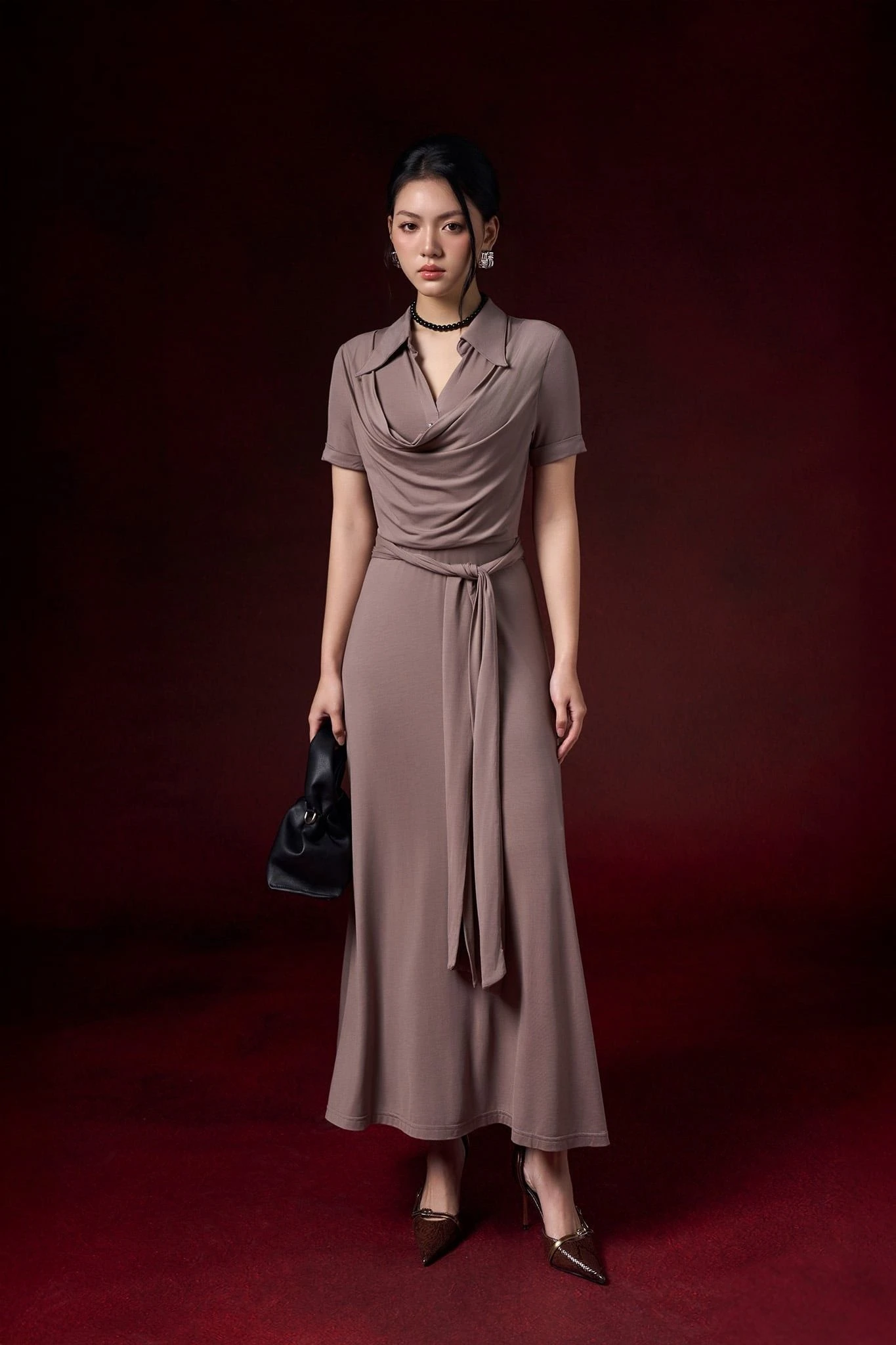 Vẻ đẹp trẻ trung được thể hiện rõ nét qua thiết kế váy thắt eo bản rộng giúp cố định phom dáng. Sự kết hợp giữa cổ đổ tinh tế và gam màu nâu tây tạo nên diện mạo sang trọng, phối cùng vòng cổ ngọc trai làm sáng bừng trang phục gam trầm