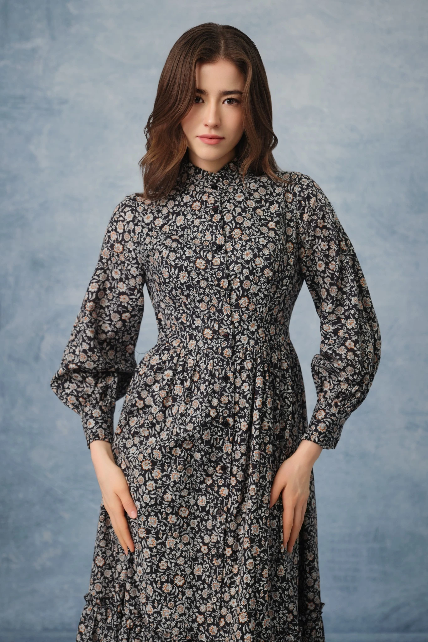 Váy hoa nhí cực kỳ hữu dụng cho cô nàng muốn giấu dáng triệt để. Thiết kế cổ ôm nhỏ gọn, phần ống tay dài chít gọn gàng, tùng váy dài quá gối tạo hình ảnh chuyên nghiệp và lịch thiệp để nàng mặc đi làm, dự sự kiện dịp đầu xuân