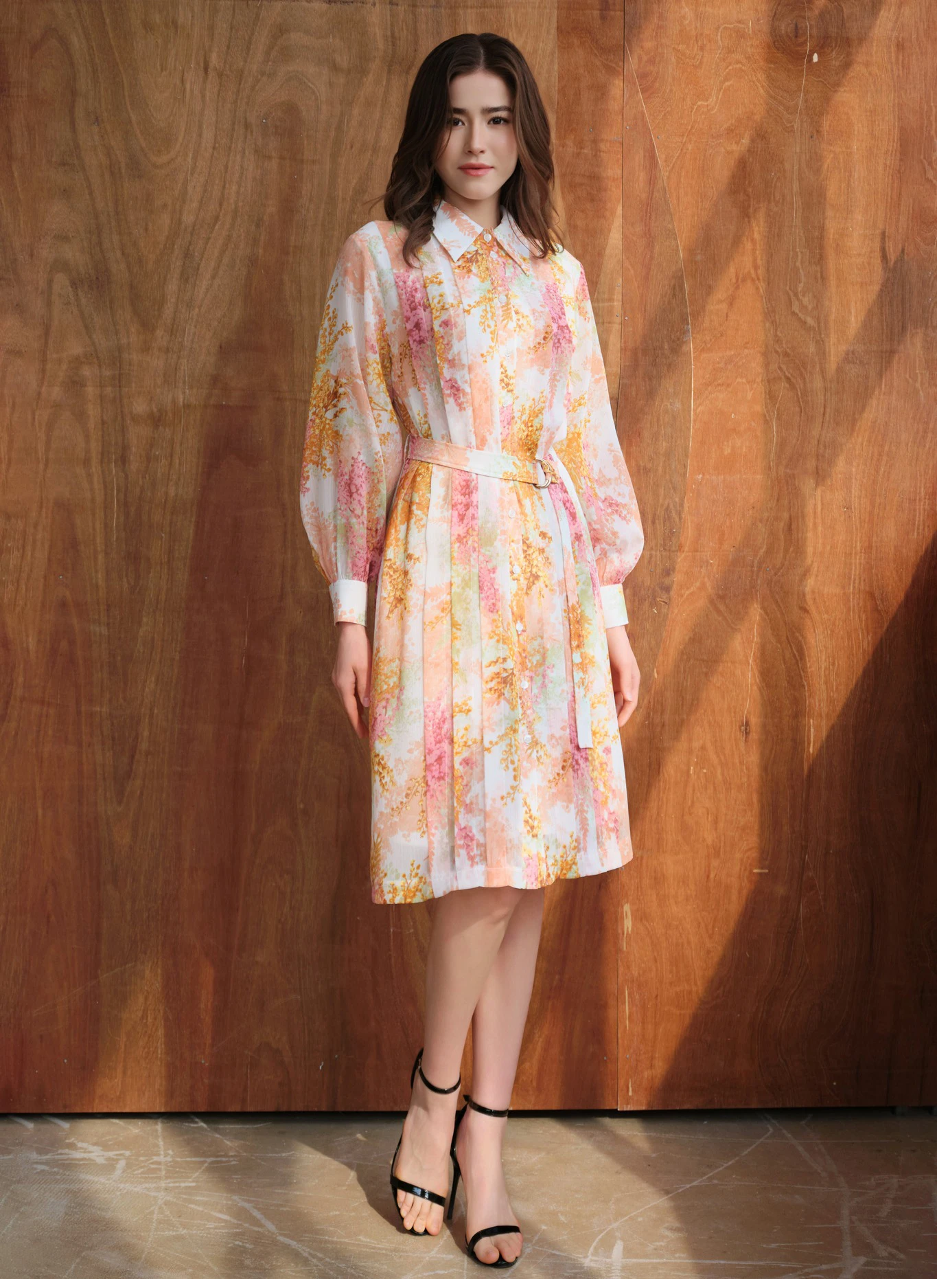 Thay vì diện váy dài đơn sắc, váy sơ mi họa tiết xếp nếp sẽ được ưu tiên hơn trong mùa xuân.