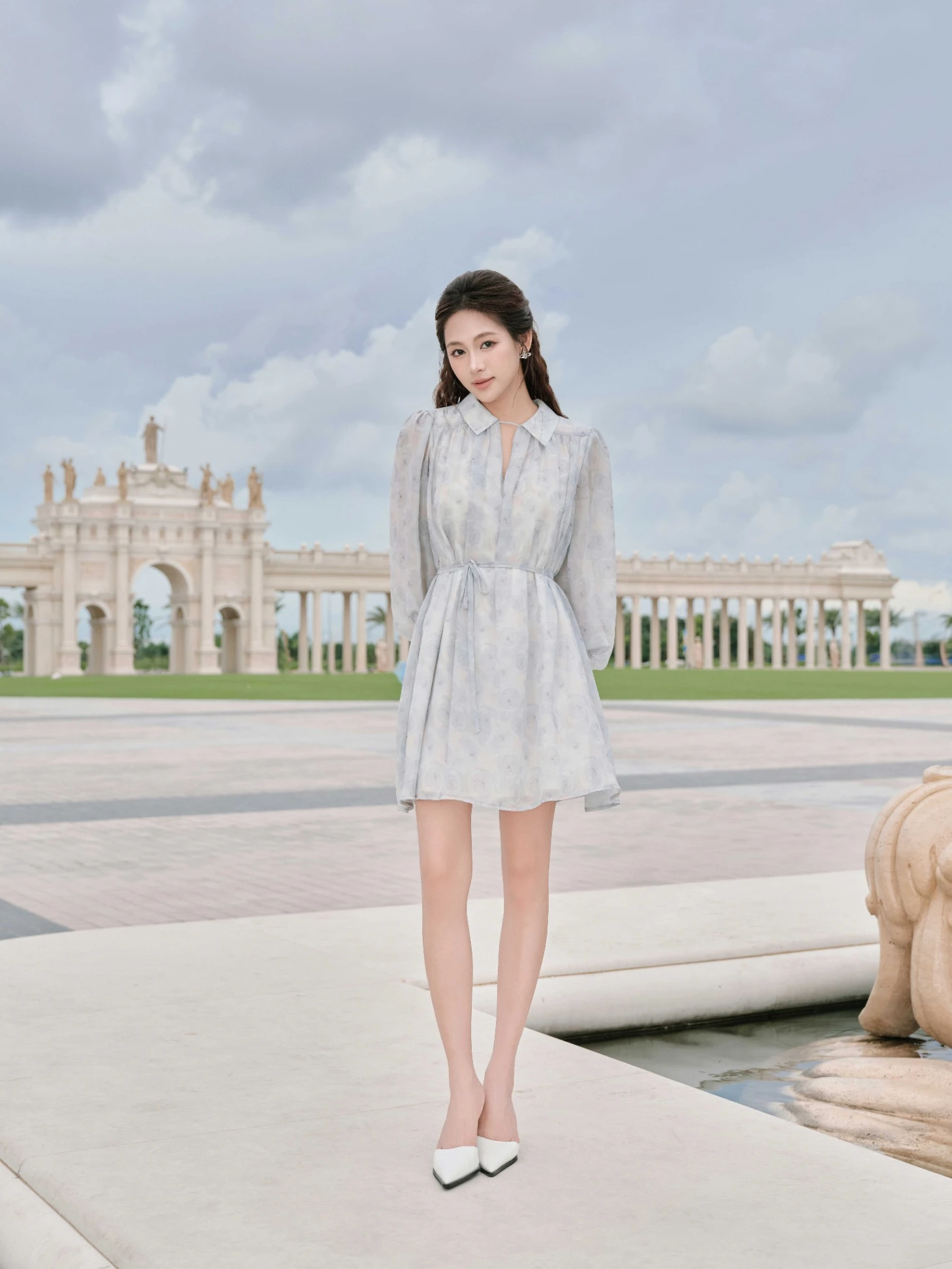 Sợi dây thắt nhỏ nhắn tại eo tạo nên điểm dừng thị giác tinh tế, chiếc váy ngắn với chất liệu voan mỏng mang lại cảm giác thoải mái cho người mặc. ẢNH: JM DRESS