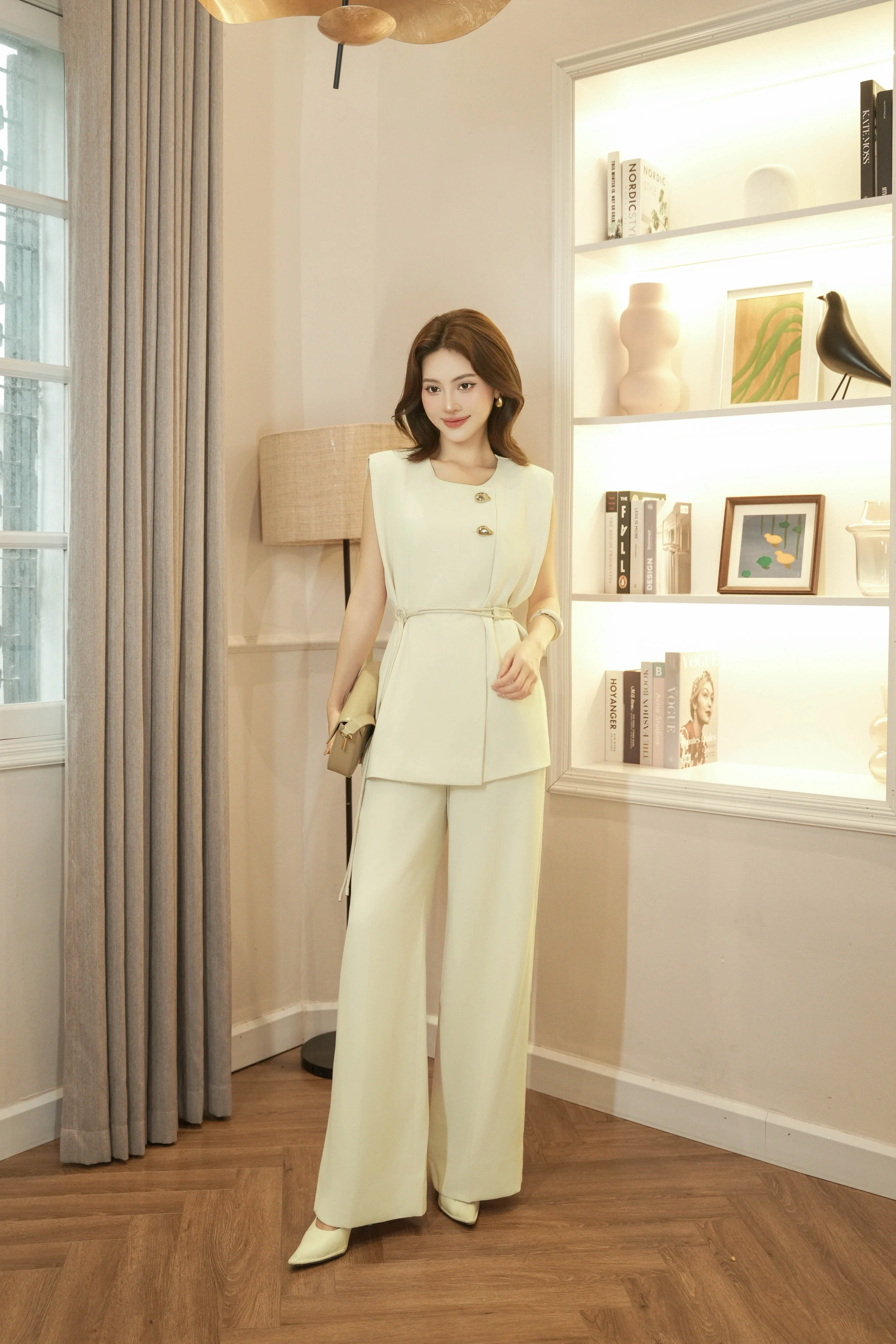 Trong những dịp đặc biệt, các set đồ thắt dây eo chính là lựa chọn hoàn hảo để nâng tầm phong cách. Thiết kế phần thắt eo mảnh mai kết nối hài hòa giữa phần áo vắt chéo và chân váy lụa thướt tha, gam màu trắng kem chủ đạo mang đến vẻ đẹp thuần khiết và sang trọng, đặc biệt phù hợp khi phối cùng clutch nhỏ và giày cao gót