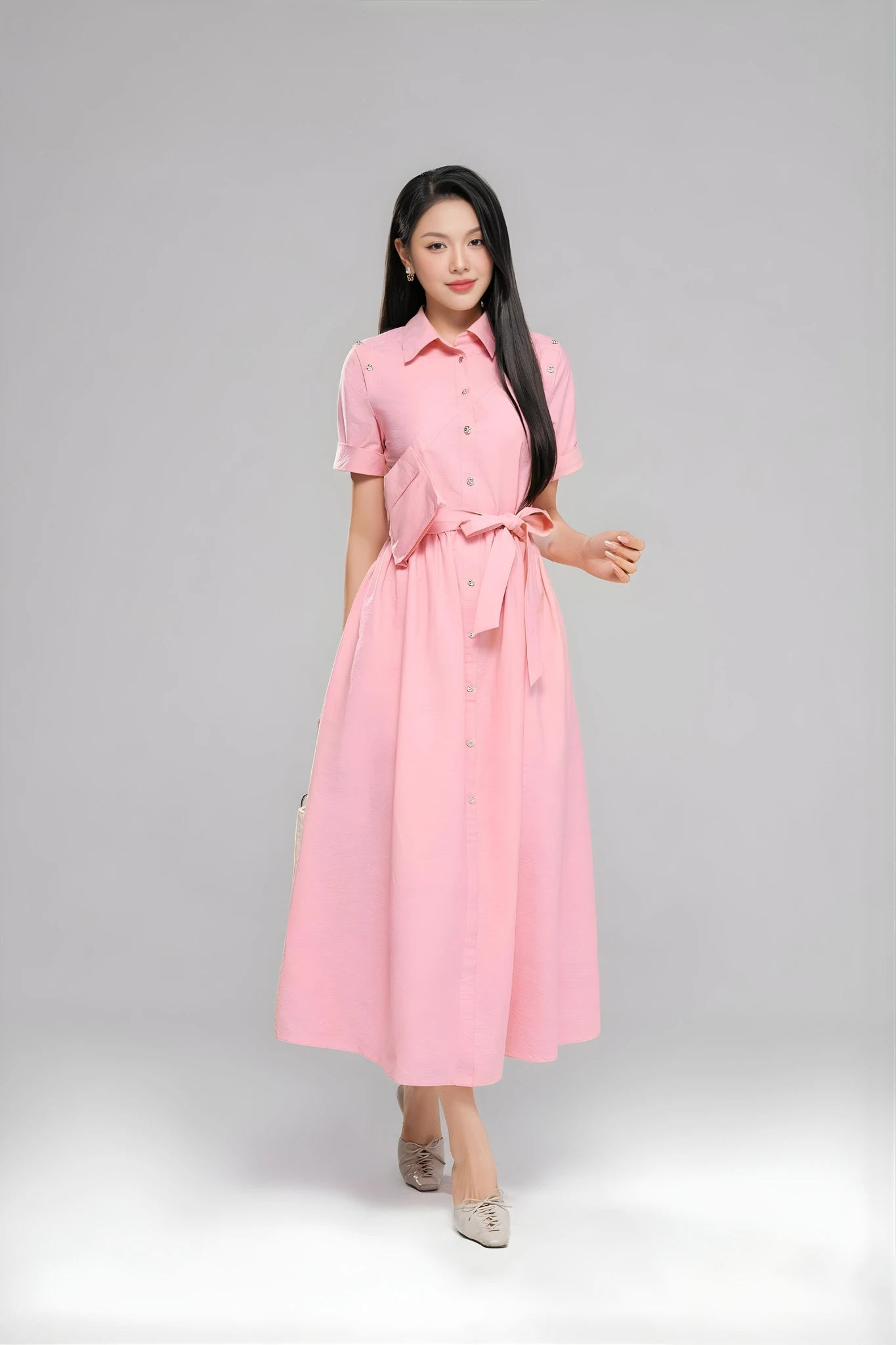 Những chiếc váy thắt dây eo luôn là lựa chọn lý tưởng để tạo nên vẻ ngoài nhẹ nhàng mà vẫn tinh tế. Chiếc váy midi hồng với dải ruy băng thắt nơ tại eo trở thành điểm nhấn mềm mại. Trên nền thiết kế váy sơ mi dáng dài, hàng khuy chạy dọc thân váy không chỉ tạo hiệu ứng kéo dài vóc dáng mà còn góp phần định hình phom dáng thanh thoát hơn