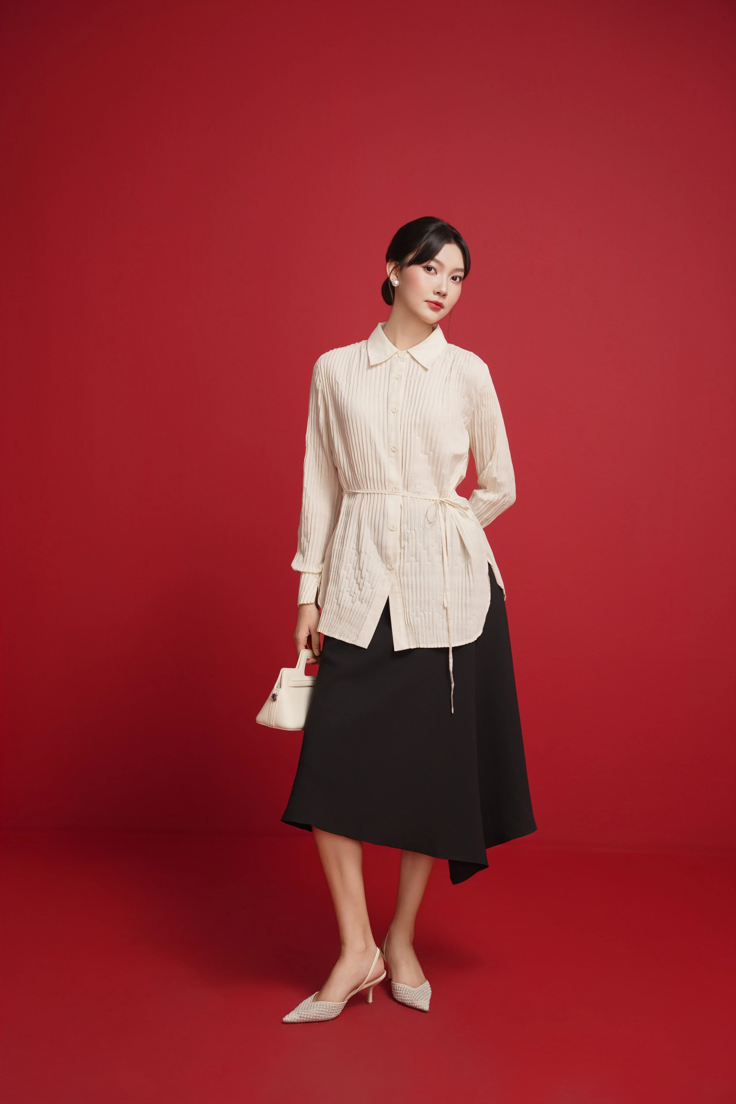 Thiết kế sơ mi dáng dài kết hợp dây thắt eo mảnh tạo nên sự cân bằng thú vị giữa nét cổ điển và tinh thần phá cách hiện đại. Chất liệu dập ly dọc góp phần kéo dài đường nét cơ thể, kết hợp cùng chân váy xòe đen và giày slingback thanh mảnh phù hợp cho những ngày làm việc cần sự chỉn chu