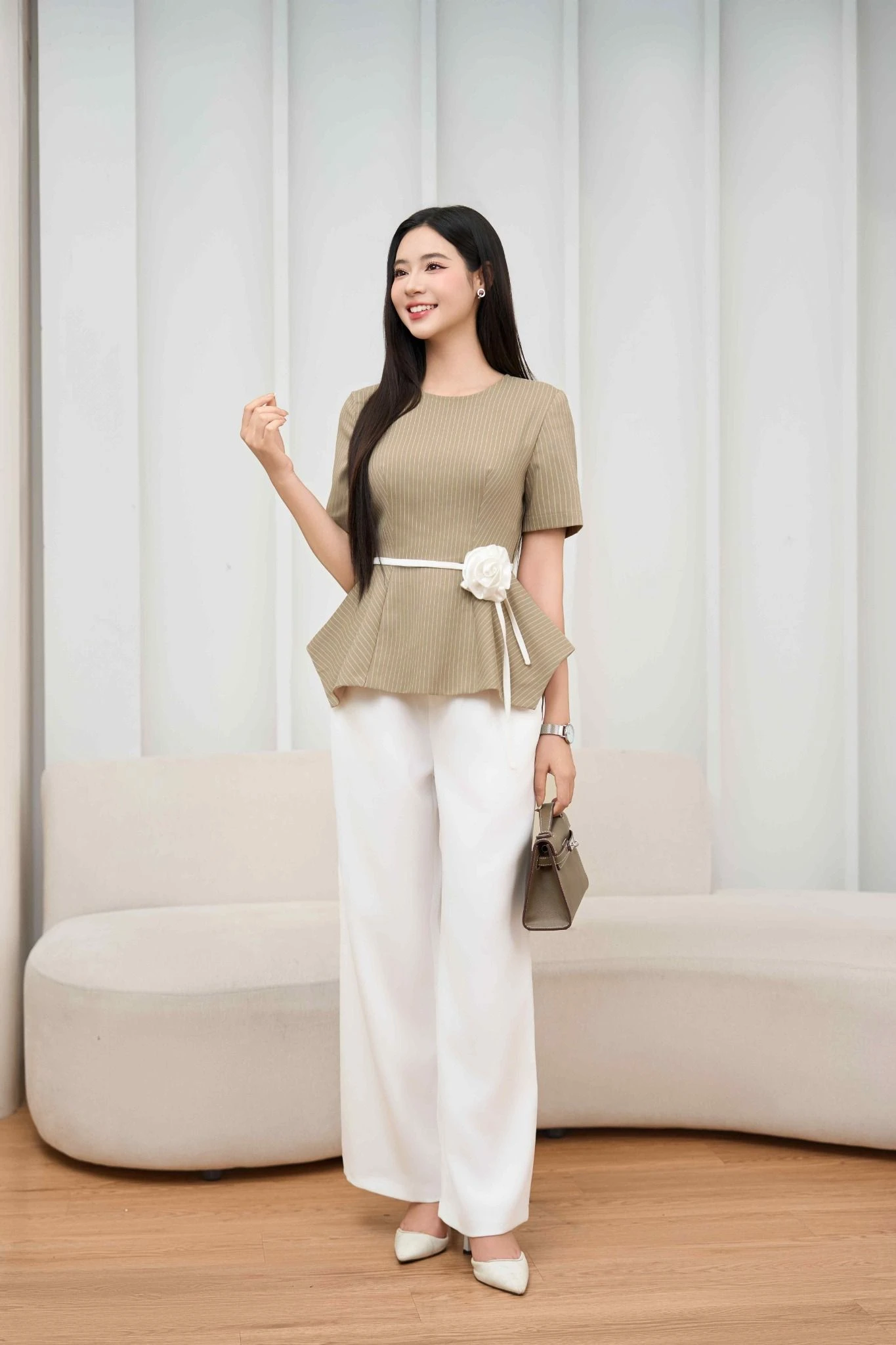 Không chỉ dừng lại ở váy liền thân, các thiết kế áo thắt dây eo cũng mang lại hiệu quả thị giác rõ rệt khi giúp vóc dáng trở nên cân đối hơn. Chiếc áo peplum với dây đai trắng thắt ngang eo trở thành điểm nhấn giúp vòng 2 trông thon gọn. Khi phối cùng quần ống rộng trắng, giày cao gót mũi nhọn và túi xách structured nhỏ gọn, tạo nên hình ảnh người phụ nữ hiện đại thanh lịch