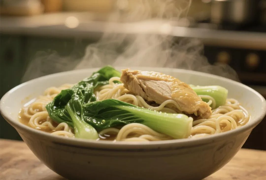 Thành phẩm: Sợi mì ấm nóng, thịt gà mềm ngon đậm đà, với hương gừng giải cảm, không chỉ thỏa mãn cơn thèm ăn mà còn bổ sung dưỡng chất cho cơ thể, giúp người cao tuổi tràn đầy năng lượng vào buổi sáng.