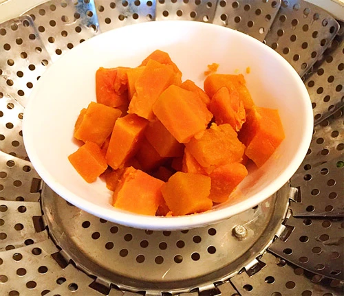 Bước 2: Để chuẩn bị bữa sáng cho 1 người, bạn hãy lấy 30g bột mè đen hạt óc chó, thêm nước ấm vào rồi khuấy đều. Sau đó cho vào hâm nóng trong lò vi sóng trong 1 phút. Cắt bí ngô thành từng miếng lớn và hấp trong nồi hấp khoảng 15 phút, đến khi có thể dễ dàng xiên qua bằng đũa.