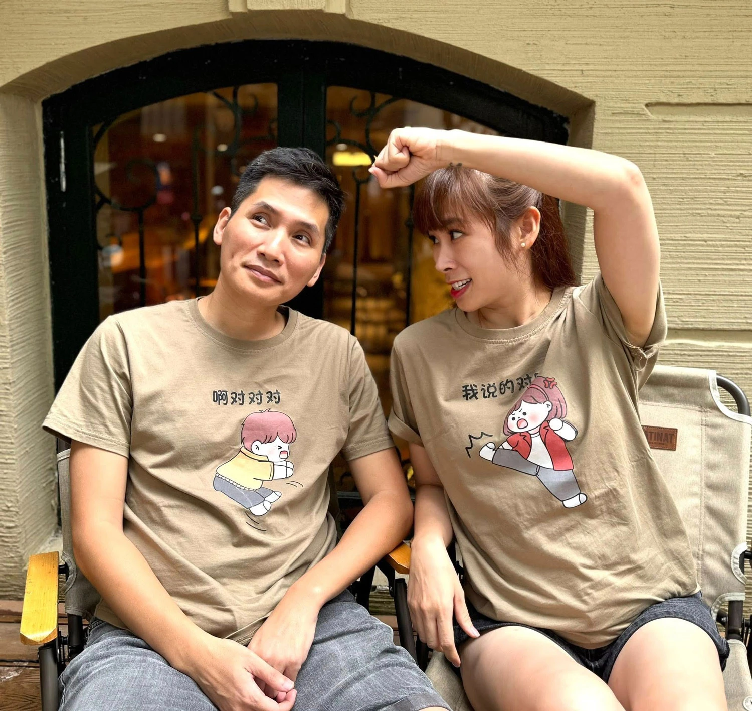 BTV Quốc Khánh mặc áo đôi, phong cách trẻ trung cùng vợ.
