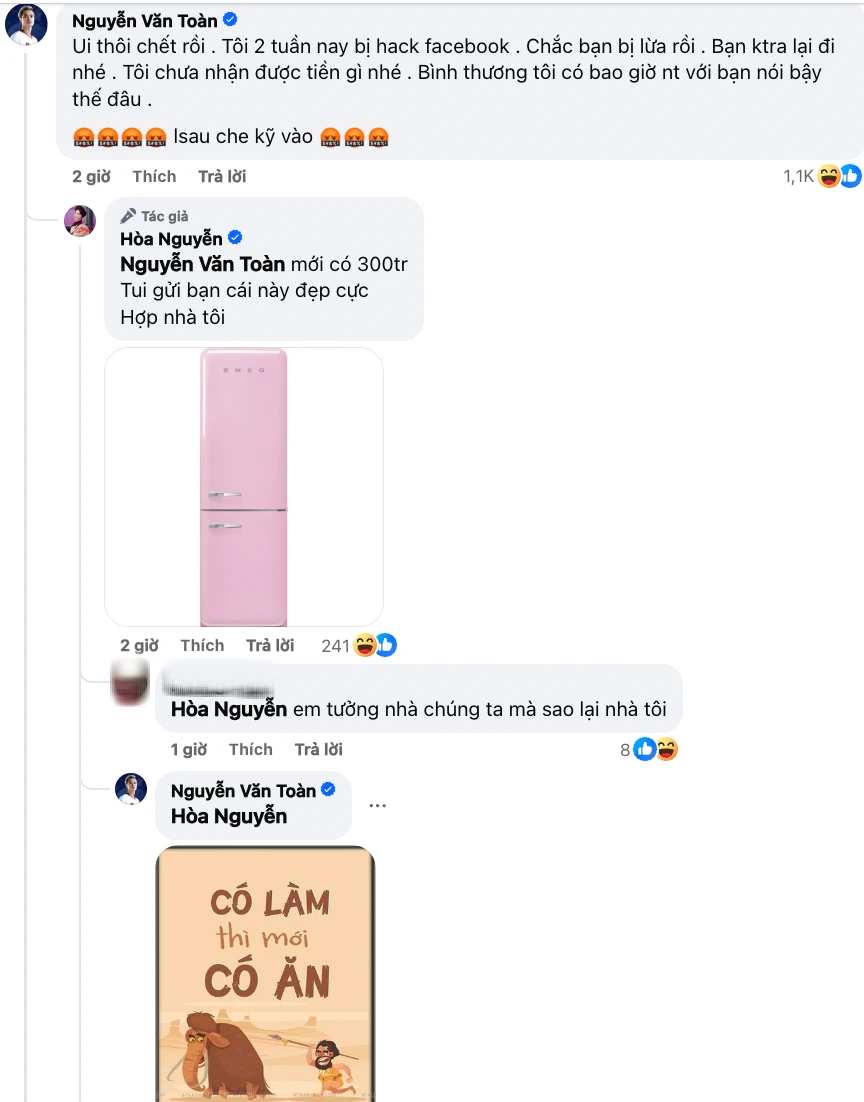 Cụ thể, Văn Toàn để lại bình luận: ” Tôi đã nhận được vé mời! Tôi không đi. Nhưng vẫn bị trừ 10 triệu tiền vé. Chúc bạn thành công kiếm thật nhiều tiền. Trả nợ! Cảm ơn “. Dòng bình luận vừa thật thà vừa mặn mòi nhanh chóng thu hút hàng trăm lượt thích và thả haha.