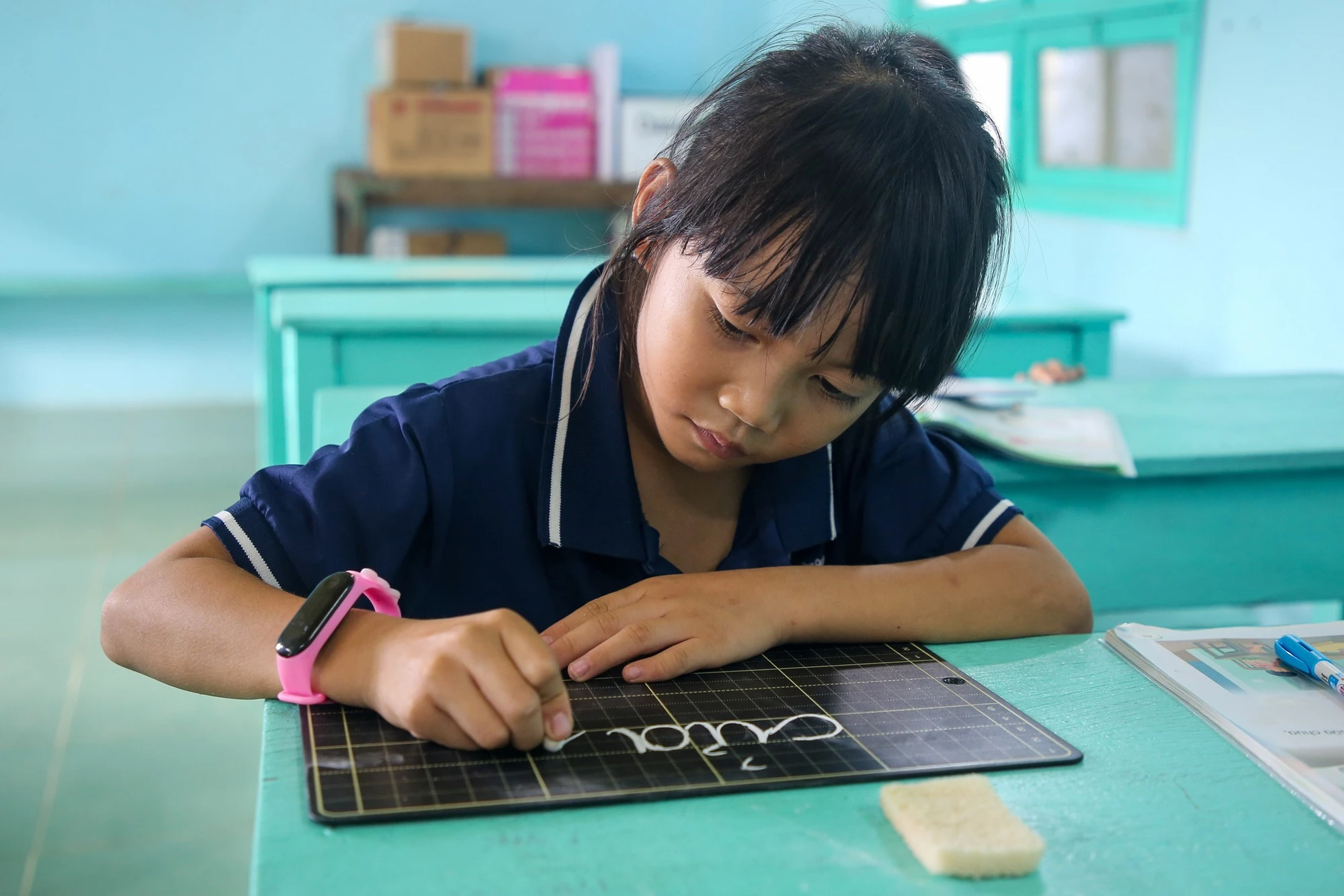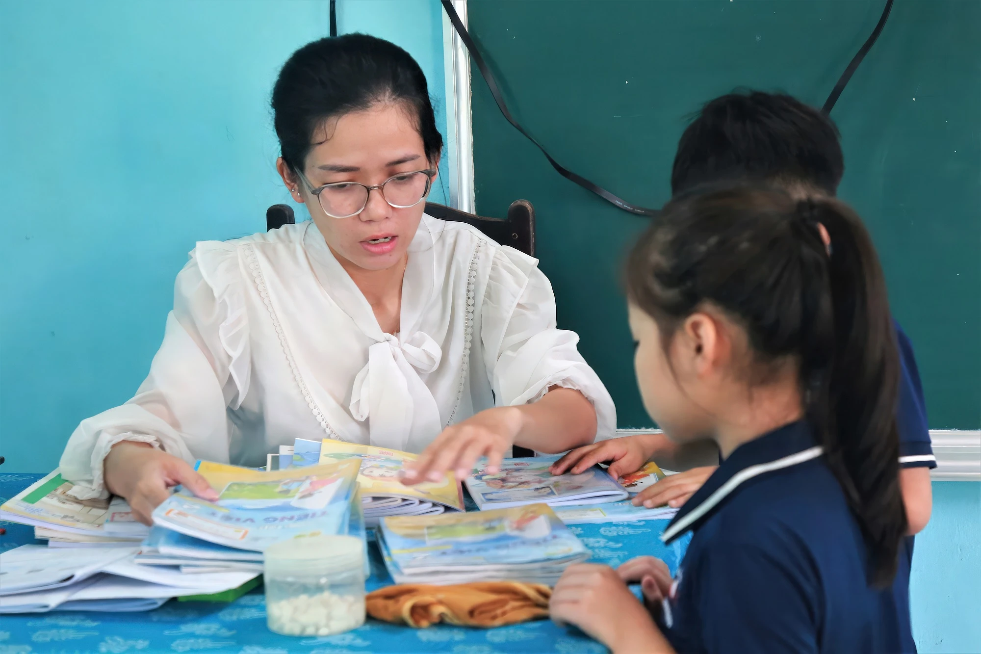 Từng nét chữ, từng phép tính, cô Yến đều tỉ mẩn chỉ cho học trò.