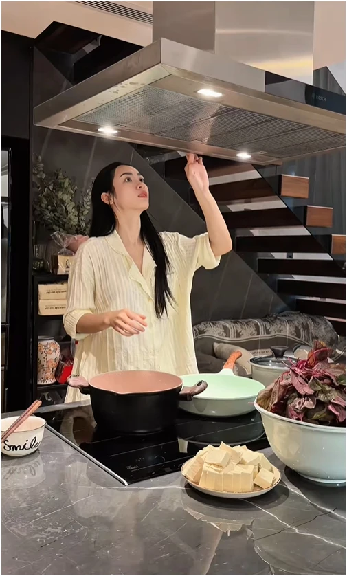 Vũ Thúy Quỳnh đứng nấu ăn nhưng thứ phản chiếu qua tủ lạnh nó… kỳ ghê!